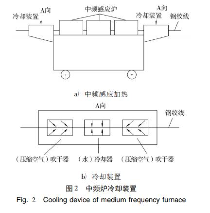 低松弛預(yù)應(yīng)力混凝土用鋼絞線廣泛應(yīng)用于高層 建筑、大跨度橋梁、核電站安全殼中[1]。由于預(yù)應(yīng) 力鋼材的應(yīng)力松弛,預(yù)應(yīng)力混凝土結(jié)構(gòu)中的應(yīng)力值 逐漸下降,使結(jié)構(gòu)達(dá)不到設(shè)計(jì)壽命而提前破壞[2]。 穩(wěn)定化處理是鋼絞線獲得低松弛性能較普遍的一種 生產(chǎn)工藝,即鋼絞線在承受 30% ~ 50% 抗拉強(qiáng)度的 張拉力下,進(jìn)行 350 ~ 400 ℃消除應(yīng)力回火。經(jīng)這種 方法處理的鋼絞線 70% 實(shí)際破斷力下連續(xù) 1 000 h 松弛值不大于 2. 5% 。 低松馳預(yù)應(yīng)力鋼絞線生產(chǎn)工藝流程: 放線→鋼 絞線捻制→張力下回火( 穩(wěn)定化處理) →冷卻→吹 干→收線。目前,穩(wěn)定化處理均采用中頻感應(yīng)加熱爐對(duì)鋼 絞線進(jìn)行回火[3]。鋼絞線穩(wěn)定化處理生產(chǎn)線使用 的中頻感應(yīng)加熱爐為移動(dòng)式,加熱爐兩端帶有冷卻 與吹干裝置,可以提高鋼絞線的成材率。