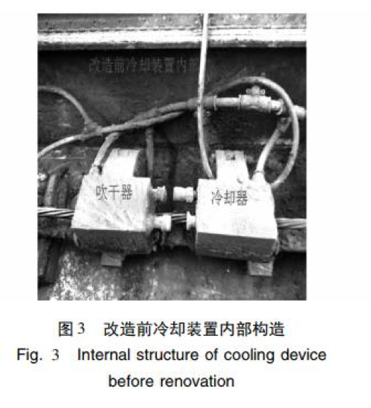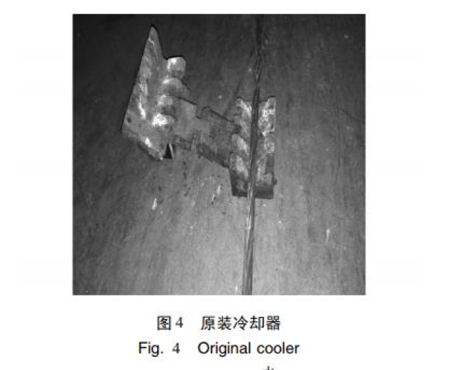 長(zhǎng)期生產(chǎn)運(yùn)行中,發(fā)現(xiàn)中頻爐兩端原 裝的冷卻裝置冷卻效果不佳,既影響產(chǎn)品質(zhì)量,又易 造成鋼絞線整根斷裂,存在極大的安全隱患,對(duì)人身 和設(shè)備造成傷害。 正常生產(chǎn)的鋼絞線經(jīng)冷卻后溫度不高于 60 ℃[4],而經(jīng)中頻爐自帶的冷卻裝置一次自動(dòng)冷卻后 的鋼絞線溫度仍然過高,約 150 ℃ 左右[5],如果此 時(shí)生產(chǎn)線啟動(dòng),將對(duì)此部分鋼絞線進(jìn)行二次加熱,由 于溫度疊加,造成溫度急劇上升,使鋼絞線加熱溫度 過高,在 30% ~ 50% 抗拉強(qiáng)度的張拉力作用下易造 成鋼絞線整根斷裂。為避免此現(xiàn)象發(fā)生,必須由人 工操作,將中頻爐在位置1 與位置2 之間行走2 至3 次,才能將鋼絞線的溫度降至 60 ℃以下。這樣操作 既浪費(fèi)時(shí)間也降低生產(chǎn)效率。而且由于需要反復(fù)多 次冷卻,中頻爐冷卻器、吹干器等相關(guān)部件使用頻次 增加,維護(hù)成本提高。 經(jīng)反復(fù)查找,發(fā)現(xiàn)中頻爐原裝的冷卻裝置( 圖 3) 冷卻效果差與其冷卻器( 圖 4) 有關(guān),原設(shè)計(jì)冷卻器與吹干器為銅制合頁(yè)式交錯(cuò)咬齒形結(jié)構(gòu),該設(shè)計(jì) 存在以下問題: ( 1) 采用噴淋式冷卻,冷卻面積小。 ( 2) 冷卻器短,長(zhǎng)度只有 135 mm。 ( 3) 冷卻水流量小,只有 16 個(gè)直徑為 1 mm 的 出水口。 ( 4) 冷卻器數(shù)量少,受設(shè)備總體布局的約束,中 頻爐兩端分別有一個(gè)冷卻器。 ( 5) 工作環(huán)境高溫、高油煙,冷卻器出水孔易堵 塞,不能正常工作。 ( 6) 生產(chǎn)線停止運(yùn)行時(shí),中頻爐由位置 2 向位 置 1 移動(dòng)過程中,由于鋼絞線沒有張力,受重力作用 鋼絞線自然下垂造成冷卻器磨損。由于冷卻器結(jié)構(gòu) 復(fù)雜難加工,因此制造成本高。