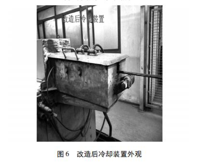 針對(duì)原中頻爐冷卻裝置存在的缺陷,經(jīng)過研究 并結(jié)合多年的設(shè)備、生產(chǎn)及工藝方面的相關(guān)經(jīng)驗(yàn),設(shè) 計(jì)出全新的 V 型直冷式可控大流量冷卻裝置。改 造后冷卻裝置內(nèi)部結(jié)構(gòu)如圖 5 所示,冷卻裝置外觀 如圖 6 所示。 改造后的冷卻裝置特點(diǎn): ( 1) 新裝置采用加長(zhǎng) V 型水槽儲(chǔ)水冷卻,水槽將原來(lái)冷卻水管道直徑由 10 mm 增加到 16 mm,冷 卻水的供給量增大了 2. 5 倍。因?yàn)?V 型水槽容積 小能使冷卻水充分快速流動(dòng)而帶走大量熱量,同時(shí) 由于儲(chǔ)水式冷卻能使鋼絞線始終浸泡在冷卻水中, 增大了冷卻的面積,只需一次冷卻即可將鋼絞線冷 卻至60 ℃以下,保證了冷卻的效果。 ( 2) 在冷卻裝置中加裝了導(dǎo)線輥,當(dāng)生產(chǎn)線停 止運(yùn)行時(shí),中頻爐由位置 2 向位置 1 移動(dòng)過程中,導(dǎo) 線輥與導(dǎo)線輪對(duì)下垂的鋼絞線起到支撐,避免鋼絞 線懸空,使鋼絞線不與噴氣吹干部分及 V 型冷卻水 槽接觸,不會(huì)對(duì)冷卻水槽產(chǎn)生磨損。 ( 3) 新的冷卻裝置與吹干裝置不會(huì)堵塞,完全 能在高溫、高油煙環(huán)境下正常工作,無(wú)需清理新的冷卻裝置與吹干裝置使用效果良好,適合所有規(guī)格鋼絞線的生產(chǎn)。改造成本低,使用壽命長(zhǎng)。 既避免了鋼絞線整根斷裂,又消除了安全隱患,實(shí)現(xiàn) 了無(wú)人化操作,提高了鋼絞線的成材率和勞動(dòng)生 產(chǎn)率。