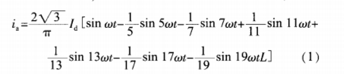 中頻電源注入電網(wǎng)的諧波主要是由整流裝置產(chǎn)生的.這里以三相6脈動全控橋式整流電路為例來分析其諧波含量忽略三相橋式晶閘管整流電路換相過程和電流脈動.假定交流側(cè)電抗為0.直流電感為無窮大,利用傅里葉分析方法,將電流負(fù)、正兩半波的中點作為時間零點,可推出交流側(cè)a相電流的表達(dá)式: