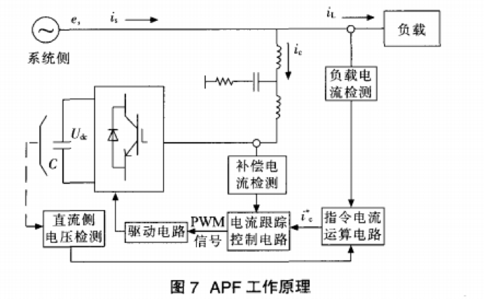 APF的工作原理如圖7所示。指令電流運算電路,一方面為達(dá)到消除諧波和補(bǔ)償無功功率的目的,將負(fù)載電流,中的諧波電流和無功電流分離出來,產(chǎn)生調(diào)節(jié)信號;另一方面為保持直流側(cè)電容電壓穩(wěn)定.采用PI調(diào)節(jié)控制法:將檢測到的電容電壓實際值與給定的參考電壓值相減之差通過PI調(diào)節(jié)器得到調(diào)節(jié)信號,并將作為實際的補(bǔ)償電流指令值疊加到i。上,即: