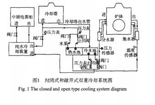例如圖1是封閉式和敞開式雙重冷卻系統(tǒng)原理圖,主要對(duì)中頻電源柜、爐體進(jìn)行冷卻。爐體采用開放式水冷,中頻電源柜采用封閉式水冷。不論采取哪種冷卻方式,為了確保中頻爐生產(chǎn)過程的安全,這些冷卻水路中都必須設(shè)有水溫、水樂監(jiān)測(cè)報(bào)警裝置。