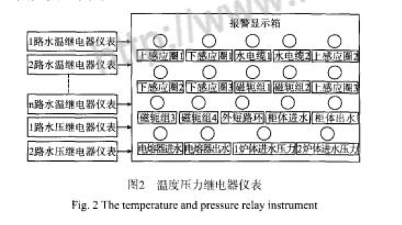 中頻電源的主控板上設(shè)有水溫、水壓超限報(bào)警指示燈,在冷卻水系統(tǒng)通好水后首先調(diào)整水壓繼電器,使主控板上水壓指示燈指示正常。另外在電源柜的進(jìn)水管和m水管及電容器出水管安裝水溫繼電器儀表,爐體出水管各路都要安裝水溫繼電器儀表,爐體進(jìn)水安裝水壓繼電器。所有水溫、水壓繼電器信號(hào)連接到報(bào)警顯示箱,當(dāng)某一路超限或有故障時(shí),報(bào)警箱中報(bào)警燈亮,并可發(fā)報(bào)警聲音提示,即可知道哪一條水路有問題,去現(xiàn)場(chǎng)相應(yīng)位置查找故障的原因。原琿框圖如圖2所示。