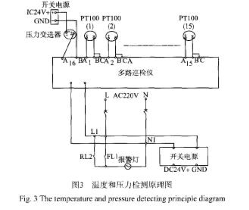 溫度、壓力巡檢儀包括開關(guān)電源、多路巡檢儀、壓力變送器、溫度傳感器、報(bào)警燈等組成??梢愿鶕?jù)用戶的需要選擇相應(yīng)的8—40路巡檢儀,按照?qǐng)D3進(jìn)行硬件設(shè)計(jì),根據(jù)巡檢儀操作面板進(jìn)行相應(yīng)的設(shè)定,可以設(shè)定多少路數(shù)、下限報(bào)警值、能夠顯示任意一路的設(shè)定溫度和實(shí)際溫度值。當(dāng)某一路發(fā)生報(bào)警時(shí)巡檢儀面板中相應(yīng)的指示燈亮,同時(shí)繼電器輸出報(bào)警燈閃光也可以進(jìn)行遠(yuǎn)傳報(bào)警信號(hào),能夠?qū)崿F(xiàn)本地控制和遠(yuǎn)傳功能。